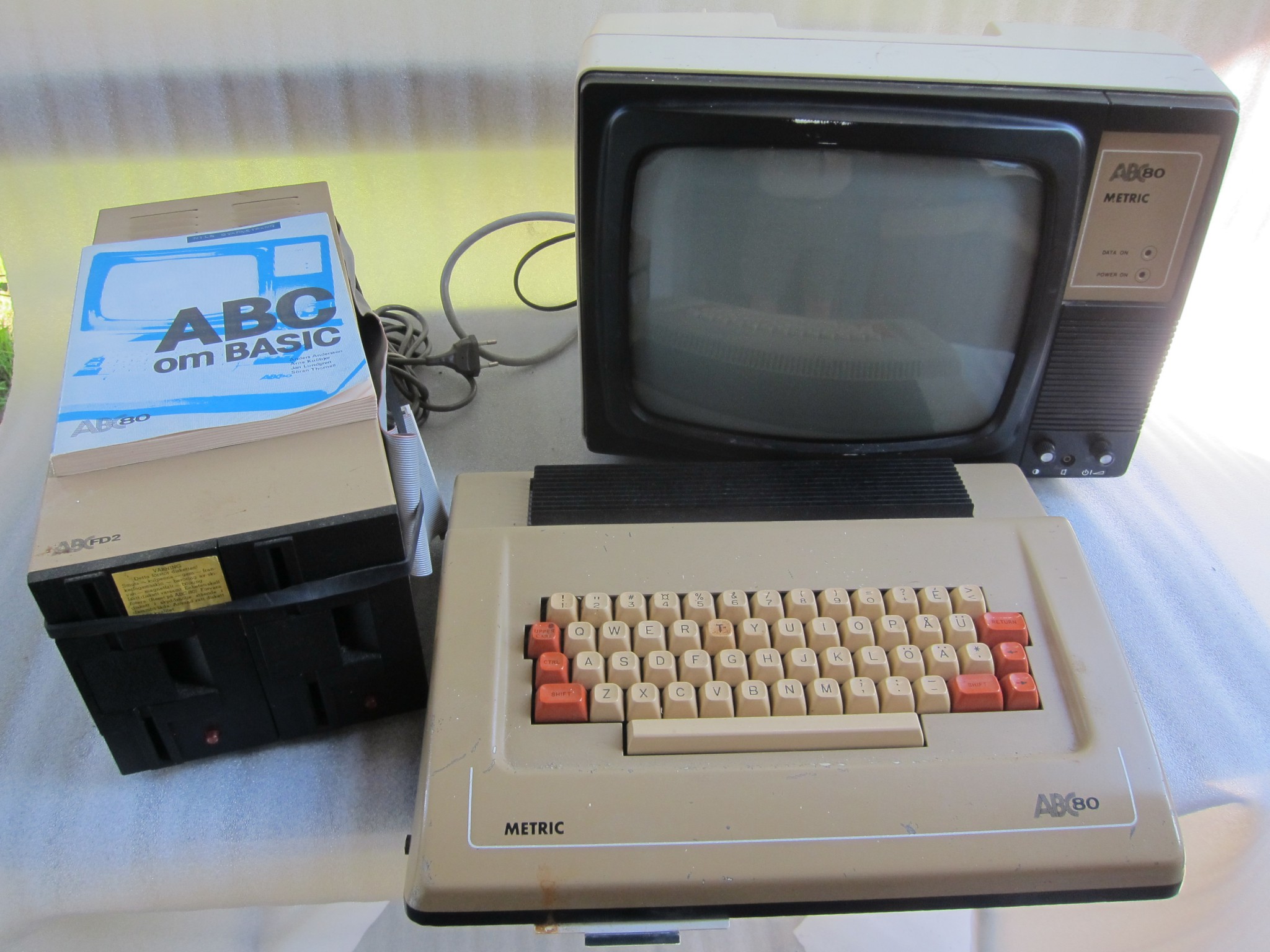 Dator ABC-80 (serie 2) 24 jul, 2015SåltErik SM7DZV Monitor, Dubbel diskettdrive ABC FD2 för 5½ tums disketter. Startdiskett (systemdiskett) saknas. Manual: Basic för ABC-datorer. Löpnummer 021